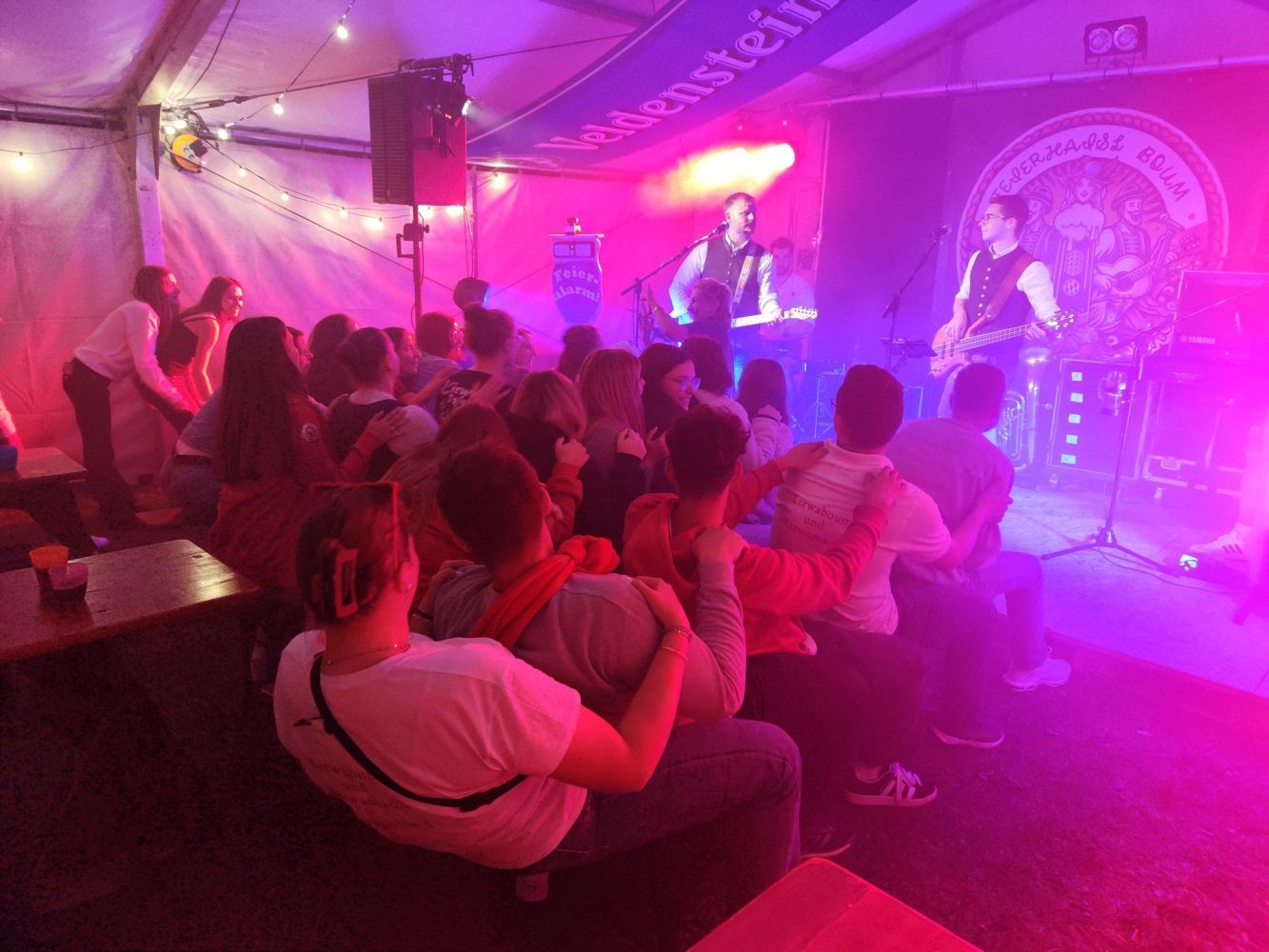 Als der Bus am Kirwaplatz vorfuhr, konnten wir das Festgelände bereits bestaunen. Es bestand aus zwei Zelten, einer Bude für’s leibliche Wohl , einer Spickerbude und einem Stand für Süßigkeiten. Insgesamt eine schöne kleine Kirwa, die viel Spaß versprach.