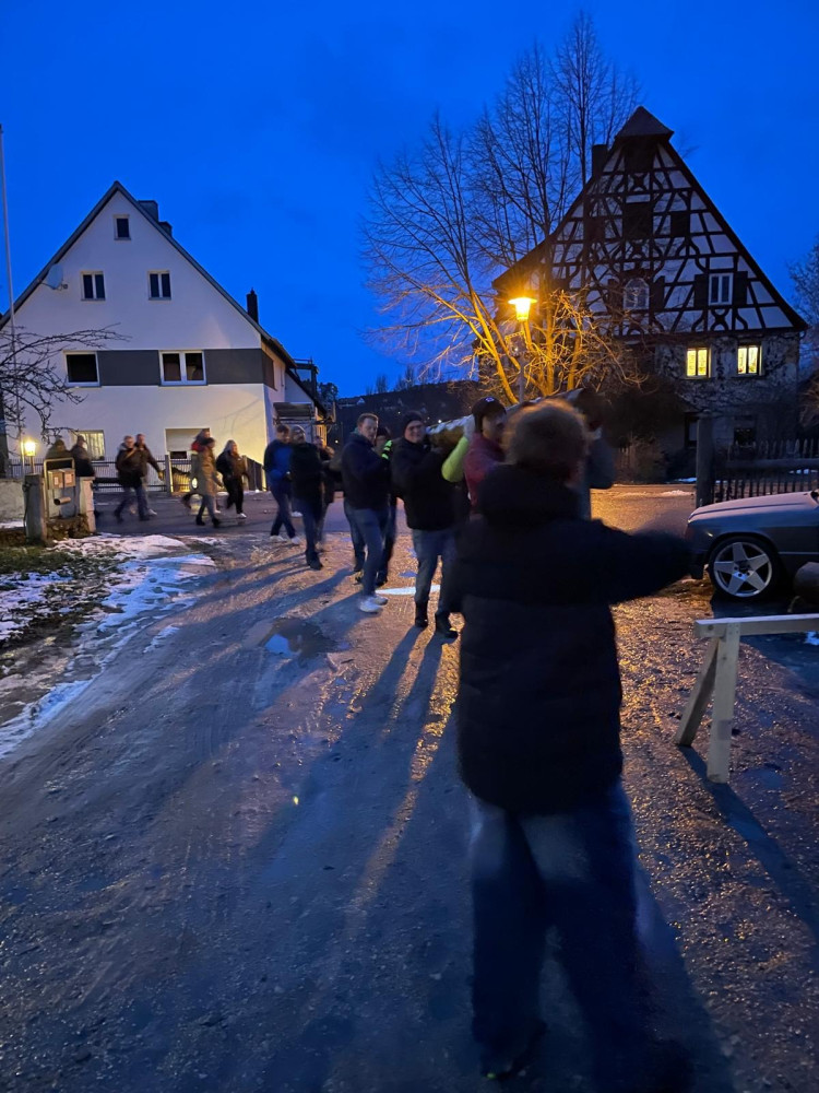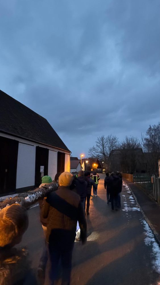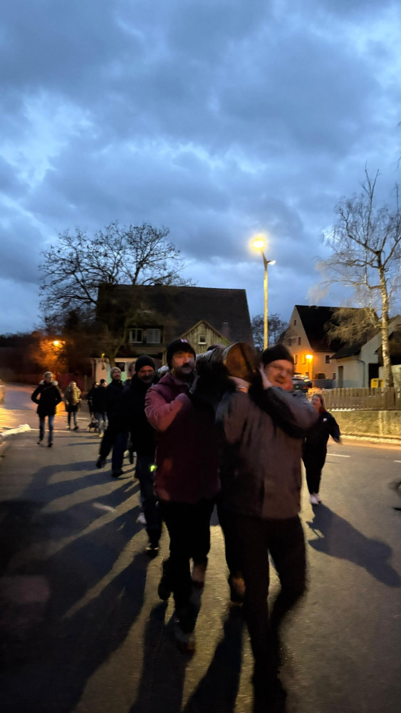 Rund 35 Kerwaboum und Madli trafen sich bei winterlichen Temperaturen am Festplatz. Gemeinsam und mit viel guter Laune machten sie sich auf den Weg, um den Kerwabaum zu Marcels Halle zu tragen. Für einen sicheren und reibungslosen Ablauf sorgte dabei die Feuerwehr Petersgmünd, die den anstrengenden Transport tatkräftig unterstützte.