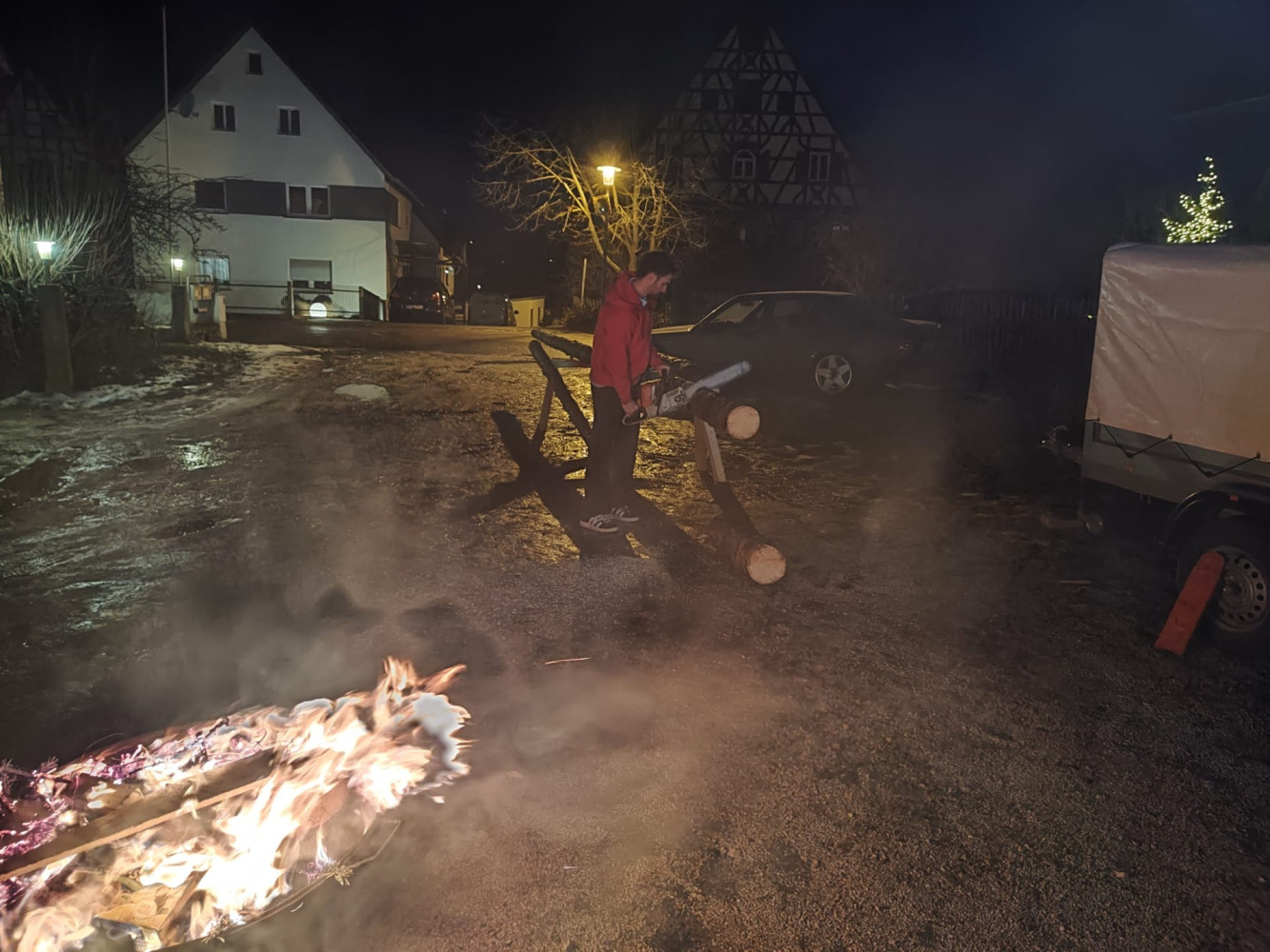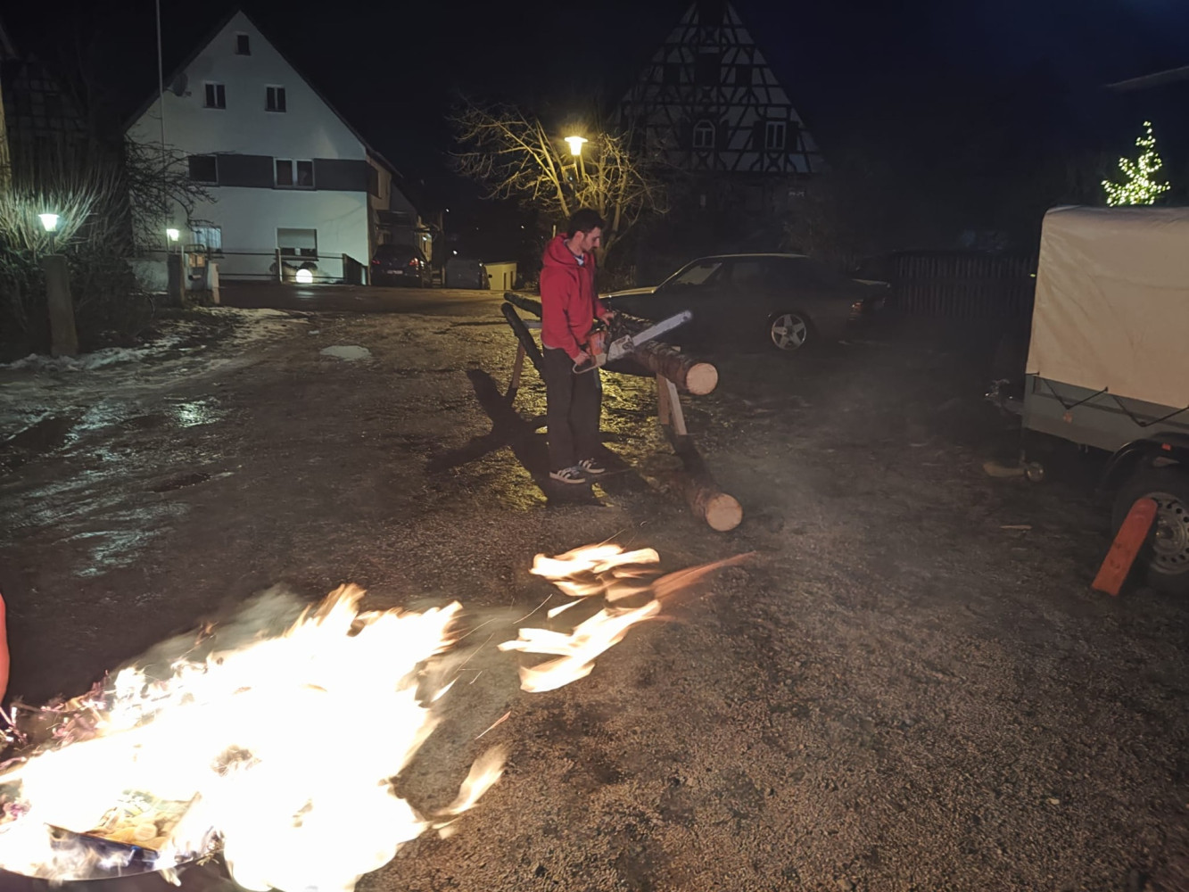 Ein besonderer Moment war, als Marcel und Julia den Baum mit einer Handsäge zerkleinerten. Auch kulinarisch blieben keine Wünsche offen. Bei Schäuferle, Salat und Käsespätzle ließen es sich alle schmecken und genossen die gemeinsame Zeit.