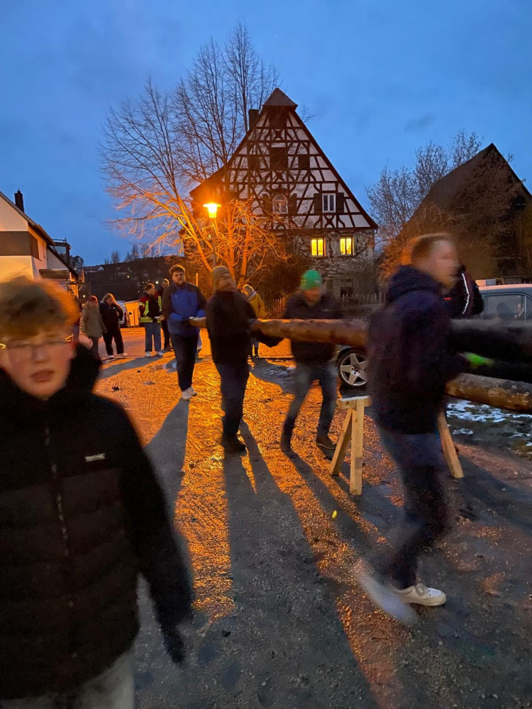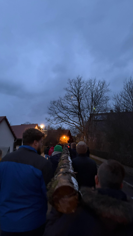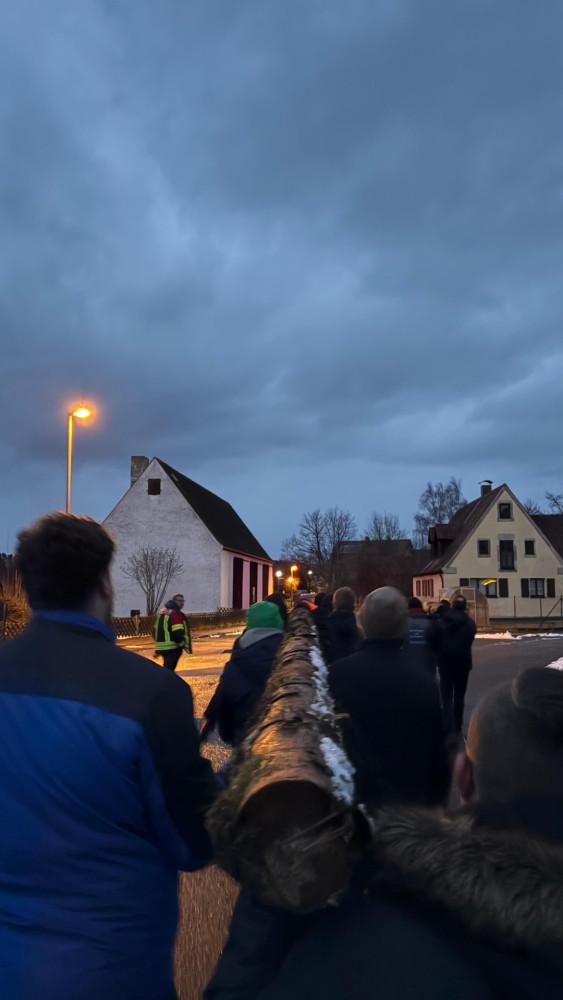 Rund 35 Kerwaboum und Madli trafen sich bei winterlichen Temperaturen am Festplatz. Gemeinsam und mit viel guter Laune machten sie sich auf den Weg, um den Kerwabaum zu Marcels Halle zu tragen. Für einen sicheren und reibungslosen Ablauf sorgte dabei die Feuerwehr Petersgmünd, die den anstrengenden Transport tatkräftig unterstützte.