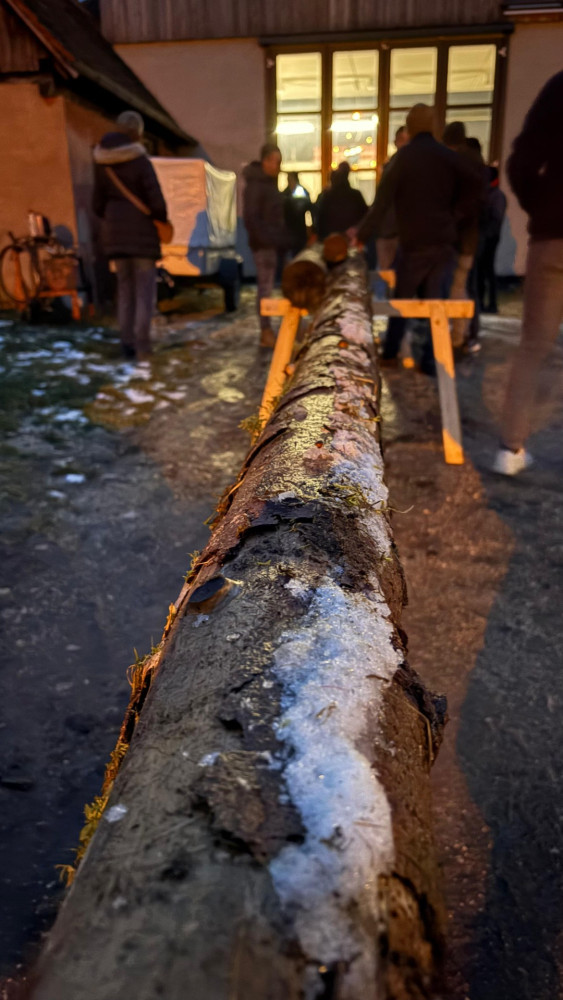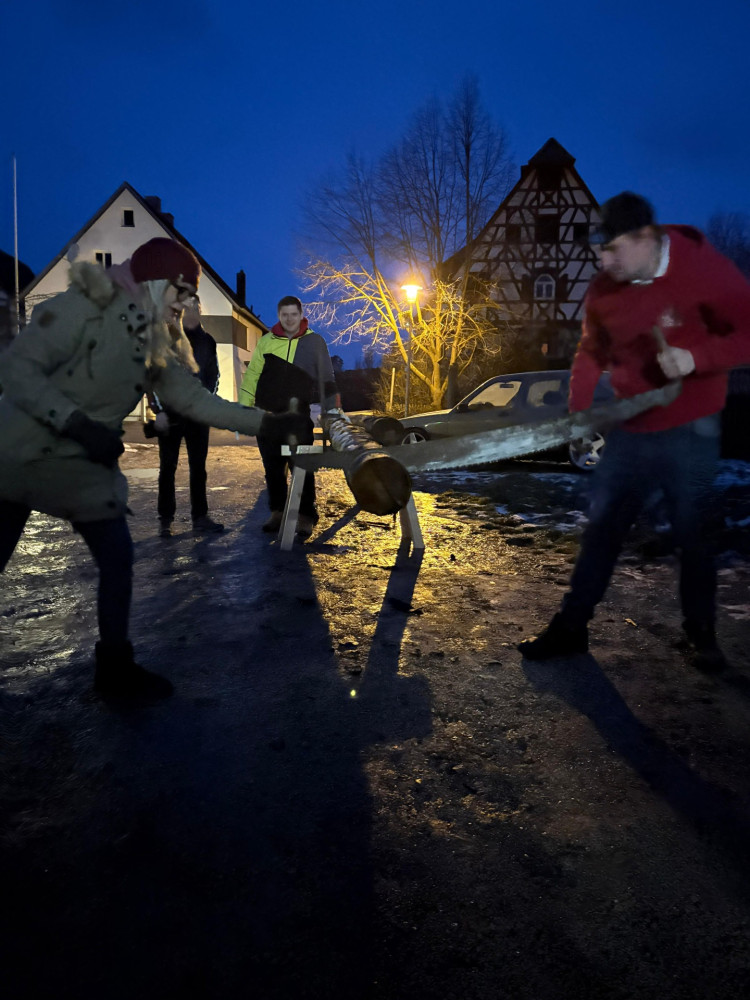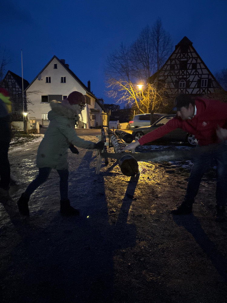 Ein besonderer Moment war, als Marcel und Julia den Baum mit einer Handsäge zerkleinerten. Auch kulinarisch blieben keine Wünsche offen. Bei Schäuferle, Salat und Käsespätzle ließen es sich alle schmecken und genossen die gemeinsame Zeit.